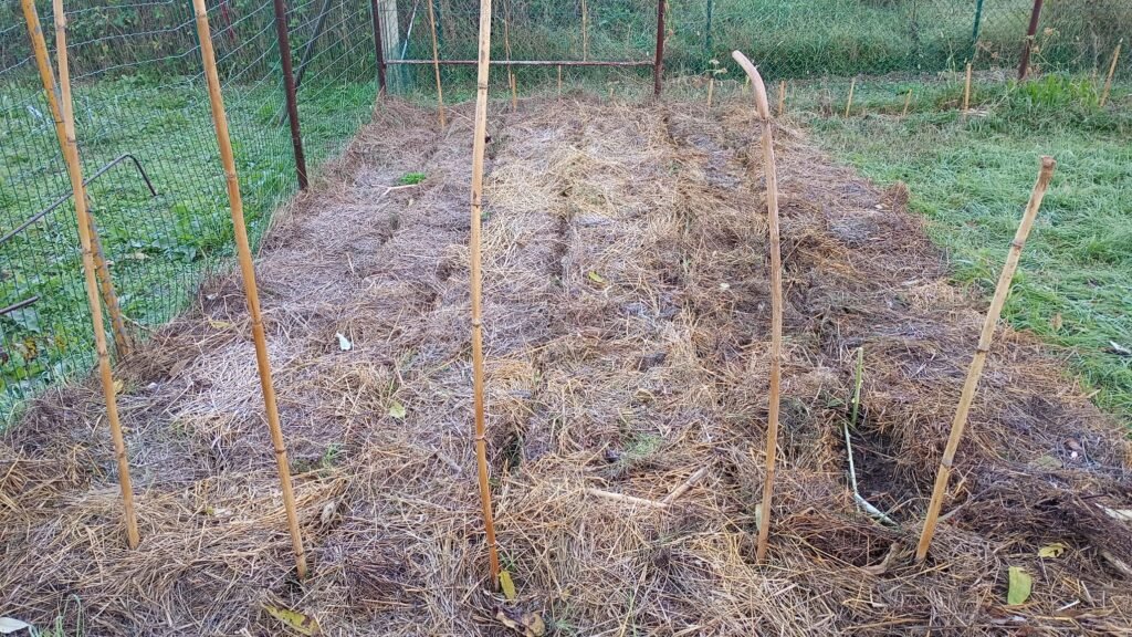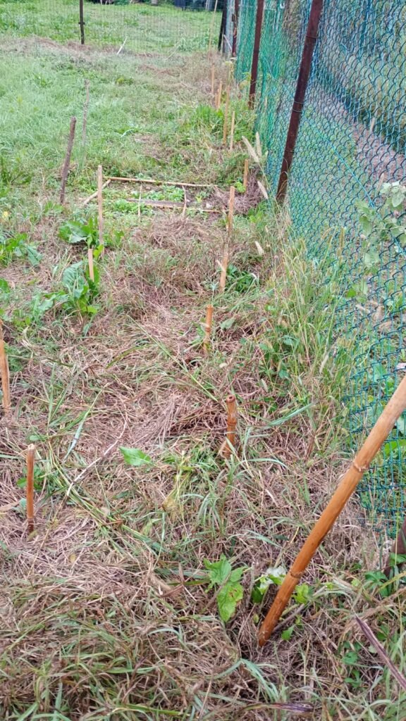Questa volta ho zappato la terra prima di piantarle, anche perché qua ci sono delle radici vecchie, forti e molto unite tra di loro. Le innaffierò per un paio di giorni, coprirò il terreno con fieno per trattenere l’umidità e per rallentare la crescita delle piante spontanee. Ma al momento lo lascio scoperto, per identificare ed eliminare i rimasugli delle piante spontanee che ho tagliato zappando.