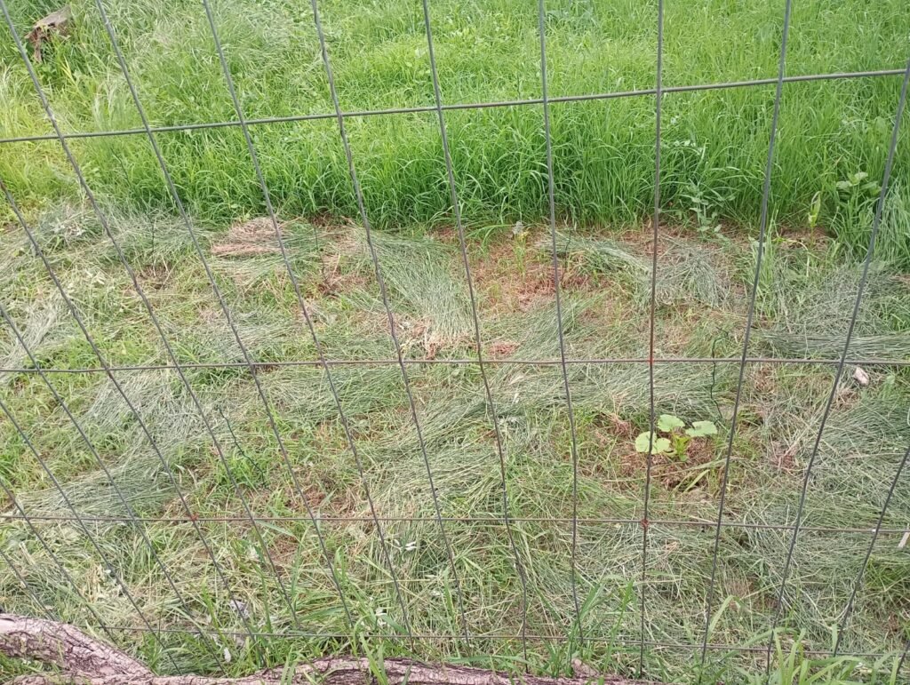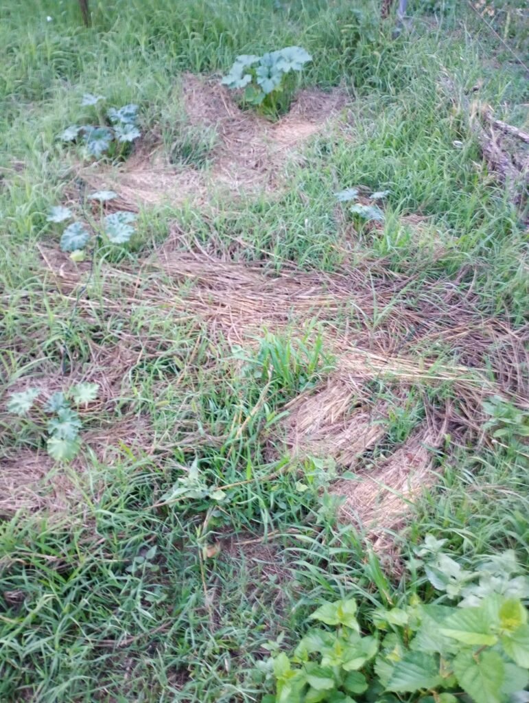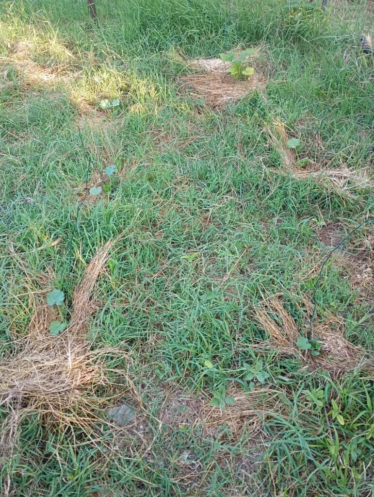 Aggiornamento 24 Luglio: Ho rotto l’erba troppo grande e ho calpestato quella piccola. Poi ho steso altro fieno, stavolta abbastanza per consentire alle piante di crescere autonomamente e passare le prossime 3 settimane di caldo, nelle quali nessuno si prenderà cura di loro.